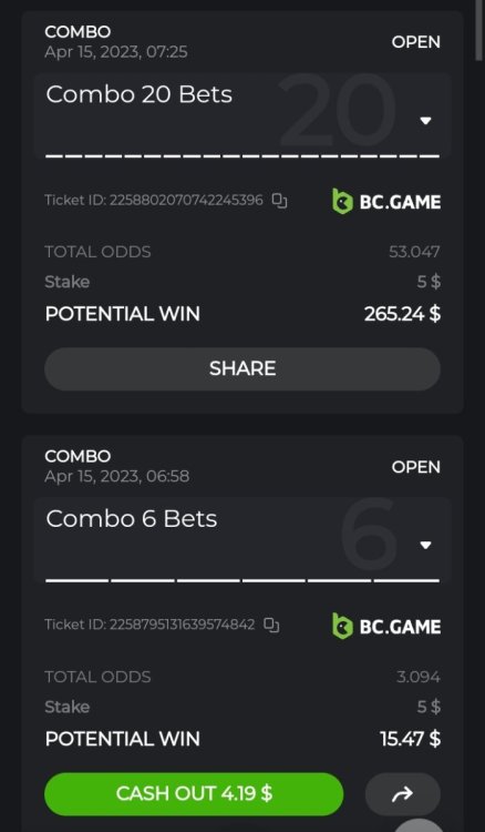 3. 6/30(tasks) Easy 1 - classic dice, 5x https://bc.game/#/sd/117GPUOPWCUIOJ 2 baccarat, tie, 9x https://bc.game/#/sd/117GQAQ5DT3YFN Medium 3 - sports, 1$, odds 2.86x 2258128995407241699 Easy 4 - Egyptian, 27x https://bc.game/#/sd/117H9B3UPBBITV 5 - sports, 1$, 1.76 x multi 2258195397564567966 Hard 6 - sports, 1$, 10x odds 2258709433397940418