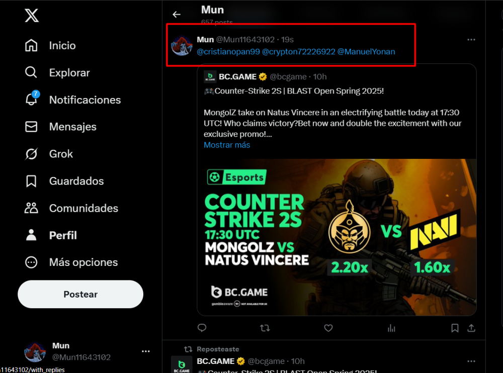 1. HARD 6. Limbo game is your target to win 200x or higher. https://bc.game/game-detail/1827307434501201443 1. Win on Wheel 48x or higher - Row 50, Segment High. https://bc.game/game-detail/1827312844856712226 Medium 1. Deposit At least $100 USD ID order: A-1827314325195331211 Txid: e697040c85293ef8ca2a8c32649fb68f7656cdb9244fd779d4c1b0616811a910 3. Get a payout of 73.6x on the original Plinko game Risk-High, Row-10. https://bc.game/game-detail/1827313990919787298 10. Buy at least 30 BC Lottery tickets using $BC Token. -or- Buy at least 2 BC Porsche lottery tickets using $BC Token send screenshot in forum post. 11. Win a sports parlay/combo bet with at least 3 matches and a 2.5x minimum payout to qualify. Ticket ID: 2515967632226787902 Easy 1. Deposit At least $50 USD ID order: A-1827314325195331211 Txid: e697040c85293ef8ca2a8c32649fb68f7656cdb9244fd779d4c1b0616811a910 2. Follow BC.GAME on Instagram, take a screenshot, and share it with your IG username in the forum! @yofreclavijo 4. Follow BC.GAME Twitter Take a screenshot of the following and include your Twitter username in the forum. @Mun11643102 5. Like and Retweet BC.GAME's latest post and tag at least 3 of your friends. Take a screenshot and include your Twitter username in the forum. @Mun11643102 6. Follow BC.GAME Facebook. Take a screenshot of the following and include your FB username in the forum. https://www.facebook.com/yofreclavijo/ 7. Win a payout of 20x on the original Limbo game. https://bc.game/game-detail/1827344509511945506 8. Win a Sports bet with a minimum payout of 1.5x odds (Only for single bets). Ticket ID: 2515280450730209380 9. Get a 20x multi in the Arabian Secret slot game. https://bc.game/game-detail/1827346561720961313 11. Activate 2FA security on your BC.Game account. Take a screenshot of 2FA and keep it active till the result is announced.