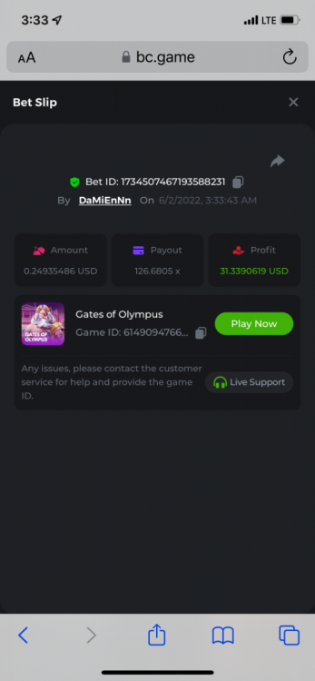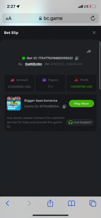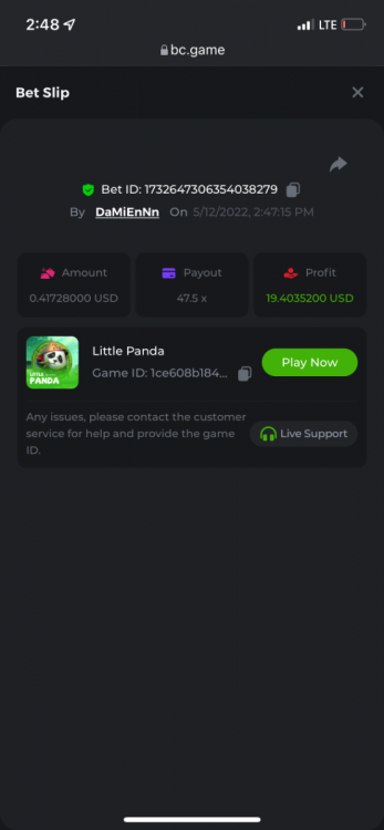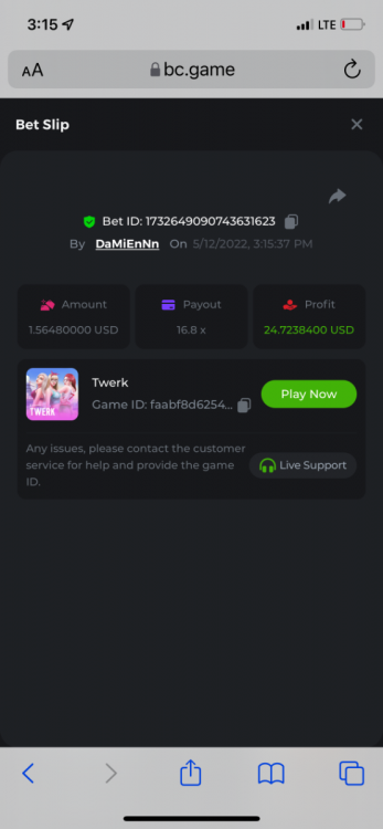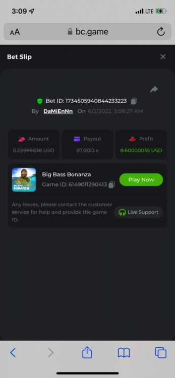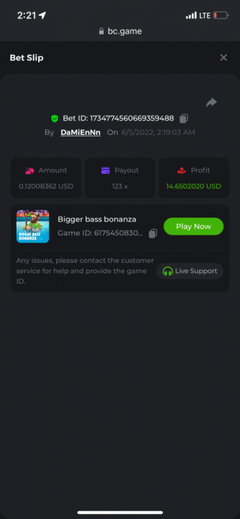 2. Limbo $2.00 bet 100x Limbo-Win 74011280171599051 7/15/2022, 9:47:30 AM $200.00 ☝lost bet ID link. So copied and pasted from my wallet transactions. https://bc.game/sd/?sd=10ORWSSCI1A58Z $4.00 bet 20x https://bc.game/sd/?sd=10ORXEQA92L4B7 $0.25 bet 500x Bounty.